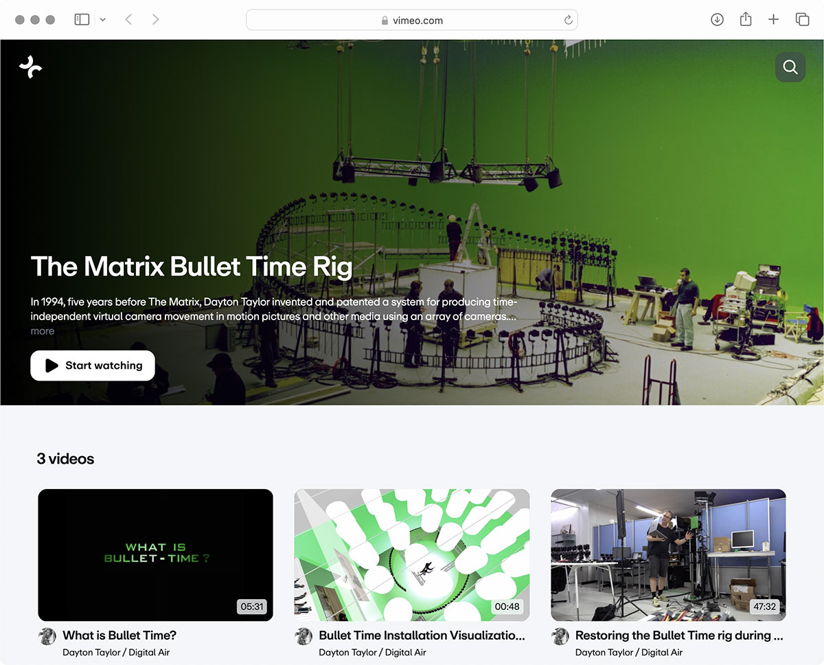 In 1994, five years before The Matrix (1999), Dayton Taylor invented and patented a system for producing time-independent virtual camera movement in motion pictures and other media. In 1995 Dayton incorporated Digital Air, Inc. in New York to commercialize his then patent pending invention. In 1996 he published "Virtual Camera Movement: The Way of the Future?" in American Cinematographer Magazine. In 1997 Dayton shot this TV commercial (link) filmed entirely in what would later be called flo-motion or bullet time, published how it was made in American Cinematographer Magazine using his then patented invention, and was contacted by the VFX team responsible for The Matrix.