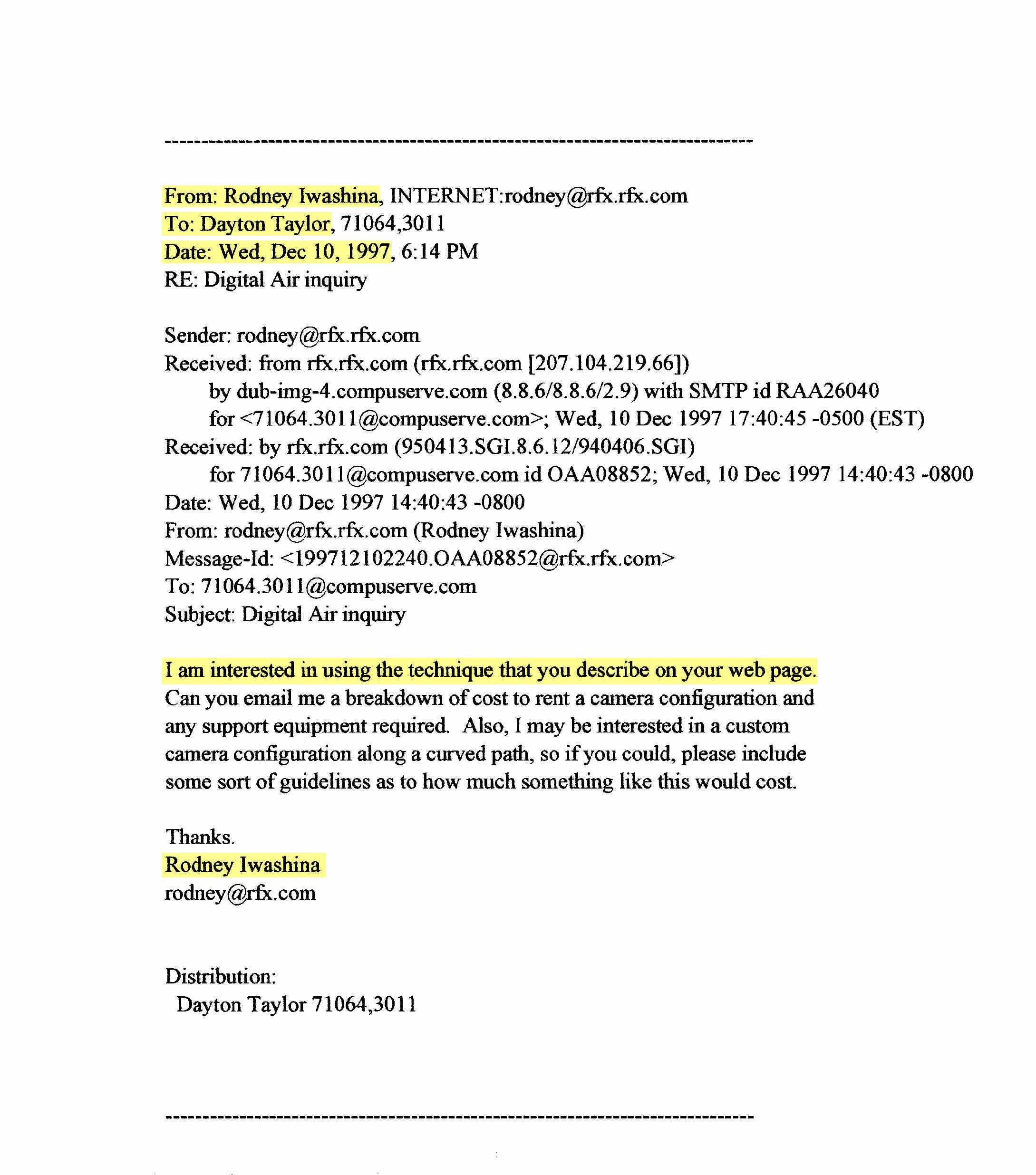 The Matrix production team built a rig specifically for the needs of the film, but with Digital Air established and Dayton's invention patented, published and commercially proven by the end of 1997, Digital Air was the principal beneficiary of the global exposure brought by The Matrix on its release in 1999. Dayton's invention had already been featured in articles in American Cinematographer, Scientific American, Millimeter, Time Magazine and Advertising Age and on ABC's World News Tonight with Peter Jennings and Dayton's original 1994 prototype was already in the permanent photographic history collection of the Smithsonian Museum of American History. Anyone looking to produce visual effects using camera arrays could find Digital Air's sample work, patents and and publications on the internet, and they could hire Dayton to work with them anywhere in the world.